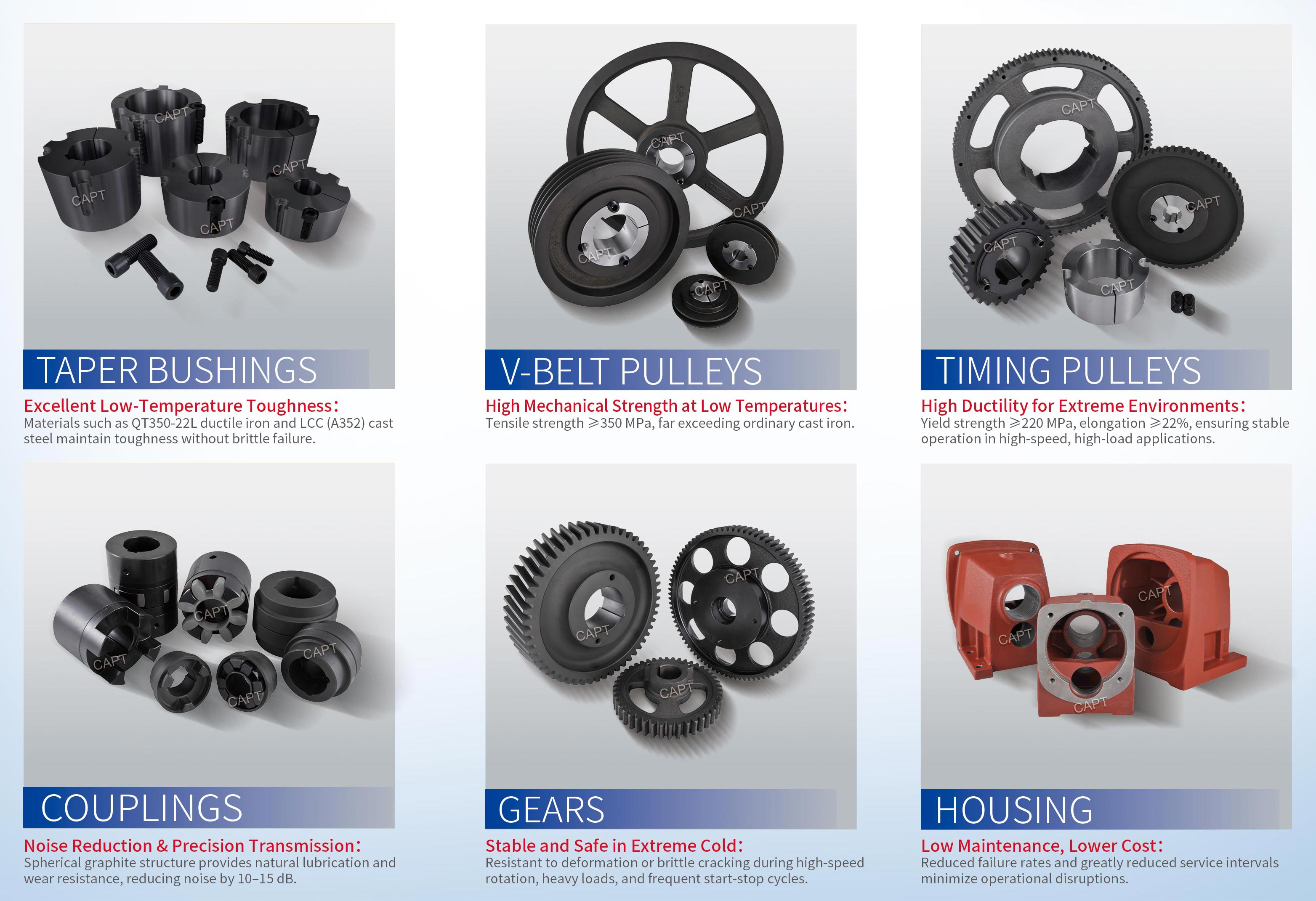 CAPT’s ultra-low-temperature ductile-iron or cast-steel transmission components—covering pulleys, timing pulleys, sprockets, gears, couplings, taper bushings, housings, and more—are engineered specifically to overcome these challenges and provide long-term reliability.