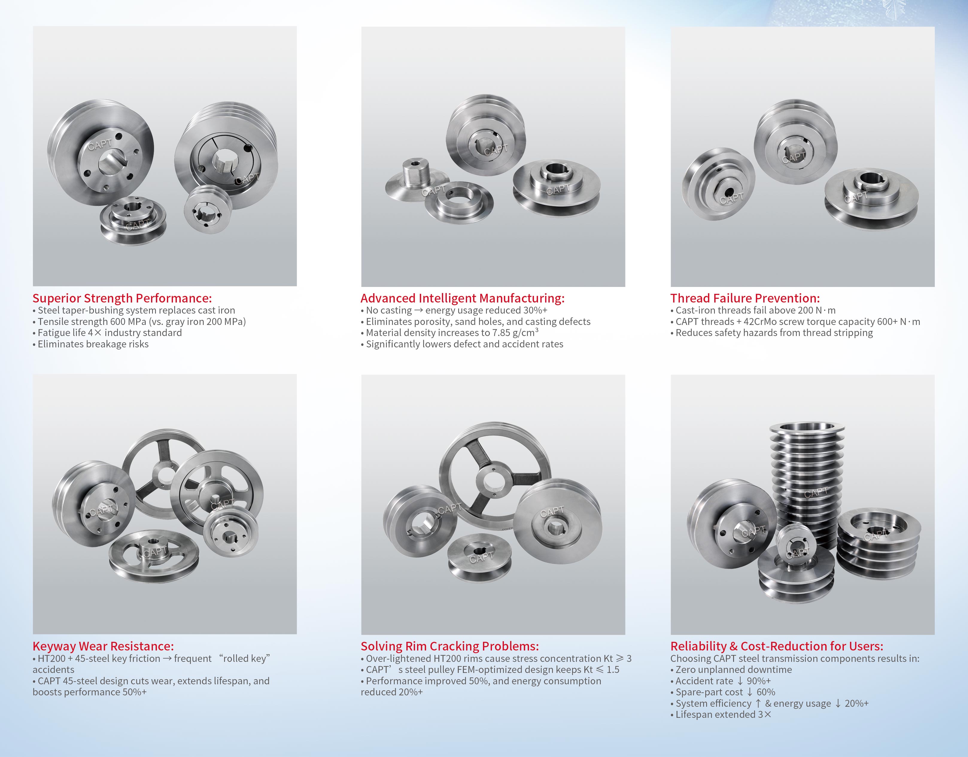 The New Industrial Standard for Small-Diameter Drive Pulleys (<200 mm). Steel drive pulleys under 200 mm are becoming the preferred replacement for traditional cast-iron pulleys due to their exceptional mechanical performance. Using advanced material science and precision production, CAPT delivers a complete solution for modern industrial transmission needs.